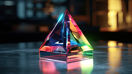 A stunning glass pyramid reflecting colorful light during sunset in an indoor setting, creating a captivating atmosphere. Generative AI
