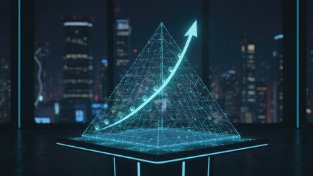 An abstract pyramid made of glowing lines and dots, with ascending arrows symbolizing wealth and success