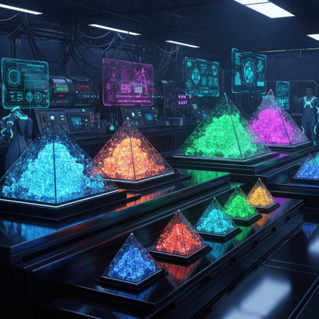 This image features several pyramid-shaped objects with vibrant, glowing interiors, set against a backdrop of a high-tech, futuristic room. The objects display various colors, suggesting energy or technology. The composition showcases a combination of artificial and natural lighting. Suitable for use in conceptual designs or science fiction content.