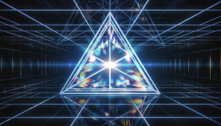 This abstract image features a glowing pyramid structure surrounded by vibrant light beams and sparkles, creating a futuristic and colorful atmosphere perfect for various design projects.