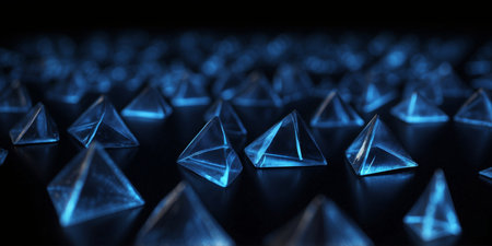 A 3D digital landscape with glowing triangular prisms, floating against a pitch-black backdrop, creating a futuristic and high-tech atmosphere.