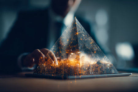 Reflective glass pyramid on table showcasing light refraction in a futuristic business setting at night
