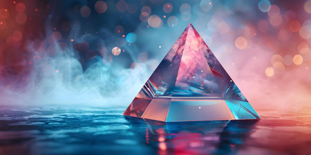 A stunning glass pyramid prism beautifully reflects vibrant colors and lights on a wet surface, creating an artistic and serene atmosphere.