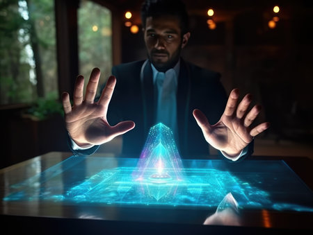 ai global network technology, hologram with light and hand of human with color glow in sci-fi futuristic concept, particle with digital data, cyber information, science and life, analysis.