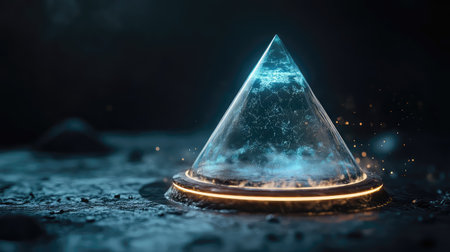 A stunning crystal pyramid rests on a textured surface, emitting a soft glow and delicate particles, evoking a sense of mystery and the intersection of art and science.
