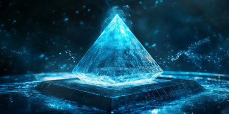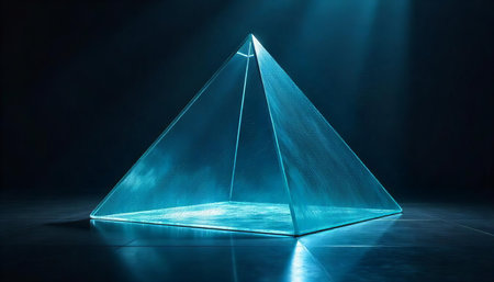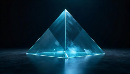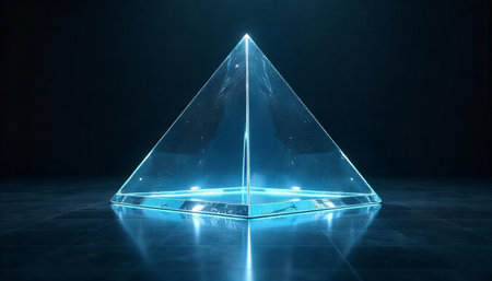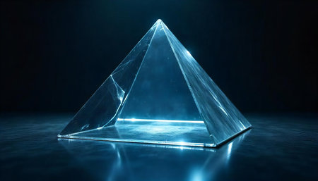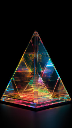 A clear pyramid is lit up by a bright light. The light is shining on the pyramid, creating a beautiful and mesmerizing effect. Concept of wonder and awe, as the pyramid appears to be a magical