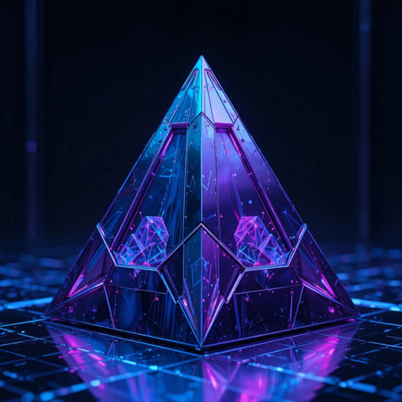 In a captivating futuristic setting, a vibrant 3D pyramid, illuminated by neon colors, symbolizes advanced data analysis, captivating tech enthusiasts and futurists with its allure