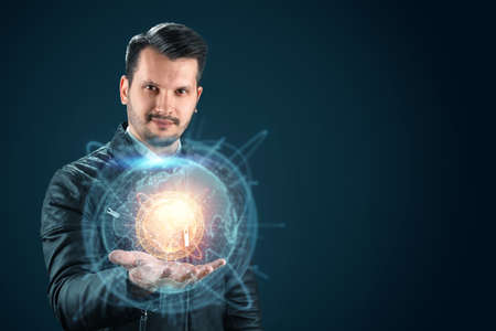 Businessman man holds a hologram of planet earth on his hand. Globalization, network, fast Internet, new technologies in communication. Copy space Mixed media