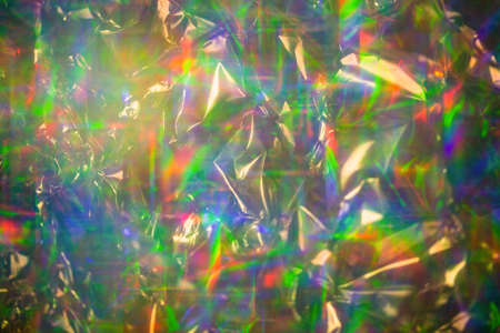 Defocused iridescent holographic background. Blurred colorful texture of wrinkled foil.