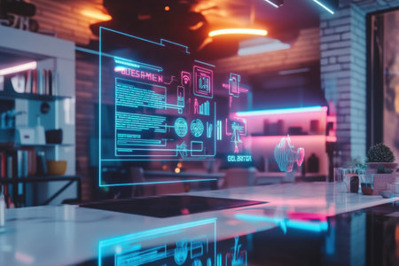 A holographic shopping list of floats in a smart home, illuminated by sleek neon lights, reflecting the integration of advanced technology in modern living spaces.