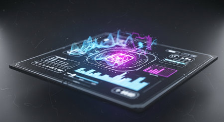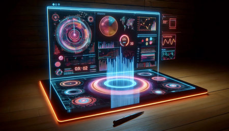 This image captures a futuristic digital interface featuring vibrant neon elements and abstract data visualizations. Ideal for tech-related projects.