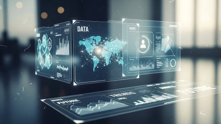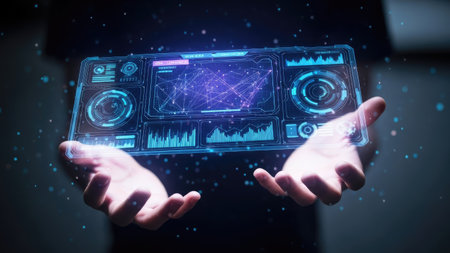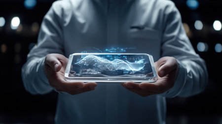 A person's hands cradle a transparent digital interface. The interface displays data visualization with blue and purple tones, illuminated by light effects. The image features a modern, technology-focused style with a focus on data analysis. This image is suitable for commercial and editorial applications.