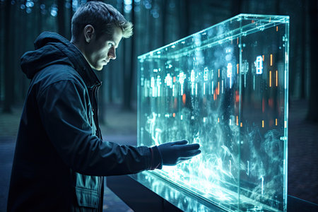 Man Immersed in Futuristic Technology, Interacting with Augmented Reality Holographic Interface.