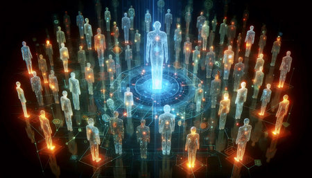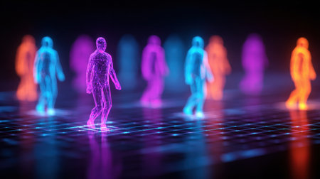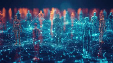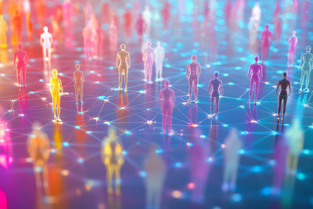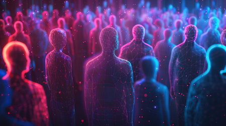 A vibrant digital scene depicts numerous semi-transparent, luminous human silhouettes interconnected through shimmering holograms, symbolizing futuristic social enga