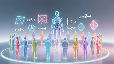 A crowd of holographic humanoids in vibrant orange and blue against a futuristic backdrop