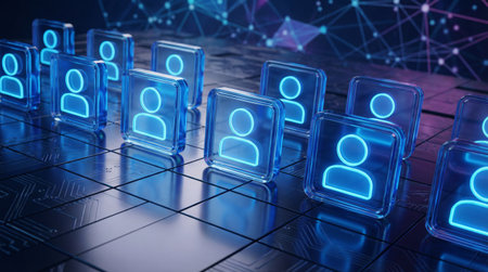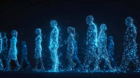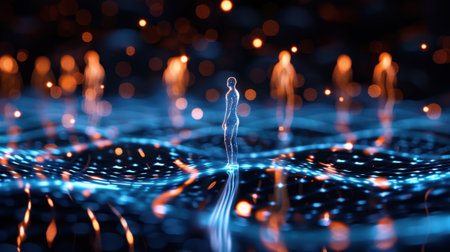 A sleek, high-tech setting featuring illuminated human silhouettes interconnected by vibrant blue lines, illustrating seamless virtual exchanges and digital collaboration