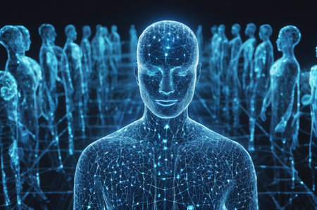 A web of glowing digital outlines linked by luminous nodes, illustrating a visionary era of interconnected human identities and virtual communication