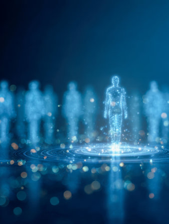 Illuminated blue holographic human forms interconnect in a sleek virtual realm, surrounded by dynamic light patterns and digital circuits, embodying innovation and s