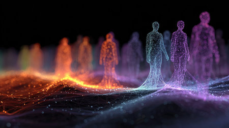 A vibrant digital mosaic of human silhouettes linked by luminous points, illustrating dynamic connections and the flow of information in a forward-looking digital re