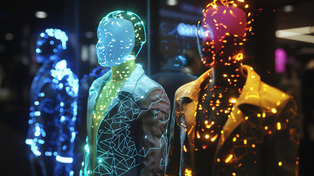 Sleek, glowing humanoid silhouettes interconnected by luminous data streams evoke a vision of tomorrow's breakthroughs and pioneering digital advancements.