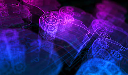 Digital faces emerge from a vibrant background, showing intricate neural network patterns and lighting effects.