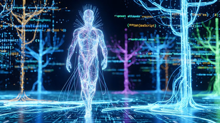 Digital human walking through a futuristic landscape of glowing data trees and code