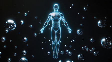 Human body anatomy with glowing particles on dark background. 3D Rendering