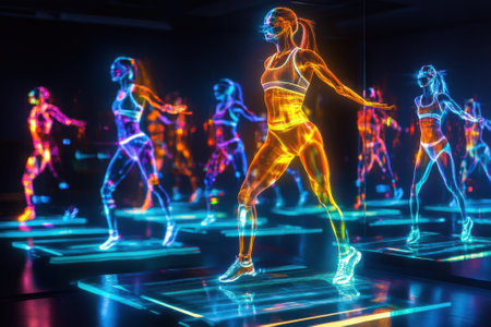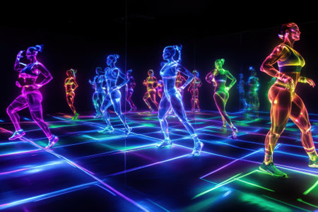 Fitness enthusiasts enjoy a lively dance workout under neon lights, brimming with energy and movement.
