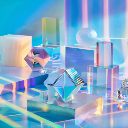 Modern Geometric Shapes and Glass Ornaments with Holographic Light Effects