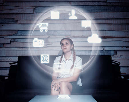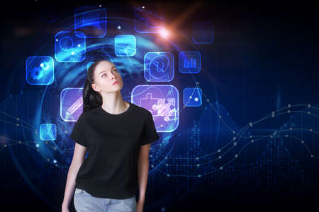 Concept of future technology or entertainment system, virtual reality. Female portrait lit by HUD interface