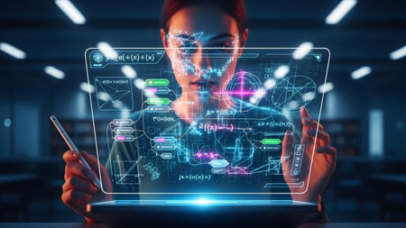 Stock showing woman analyzing a complex holographic display with mathematical formulas and...