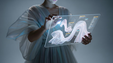 A woman with a focused expression interacts with a bright blue holographic interface displaying...