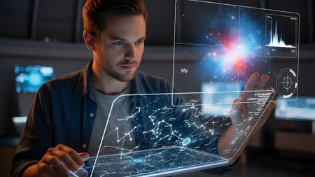 Interacts showing man interacts with holographic star map and nebula data display. High...