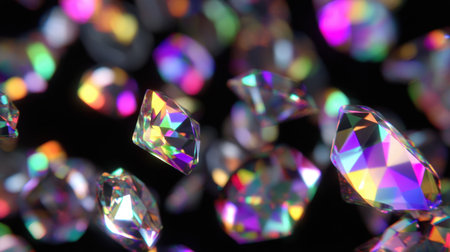 Vivid and colorful diamonds fall against a dark background, creating a stunning display of light and brilliance. The artful arrangement enhances the gems' elegance.