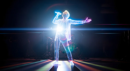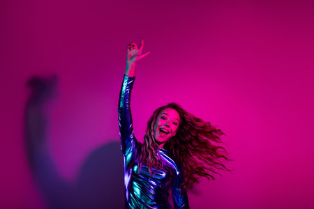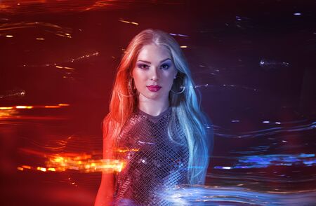 Vibrant young woman singing passionately at a nightclub party in glossy dress with bright pink and blue neon lights
