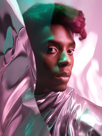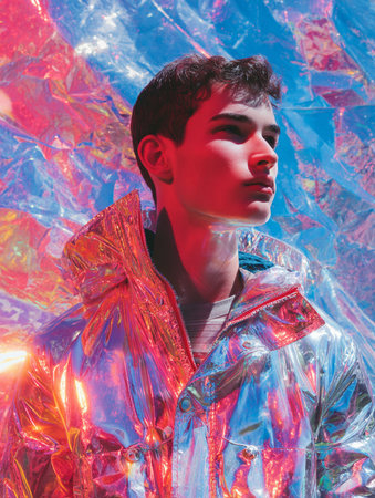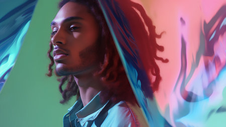 Stylish man in a white suit expressing emotions with vibrant lighting and a dramatic pose, showcasing creativity and individuality against a colorful backdrop
