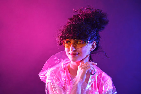 Beautiful young woman in transparent coat and sunglasses posing on color background in neon lights
