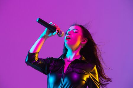 Caucasian female singer portrait isolated on purple studio background in neon light. Beautiful female model in black wear with microphone. Concept of human emotions, facial expression, ad, music, art.