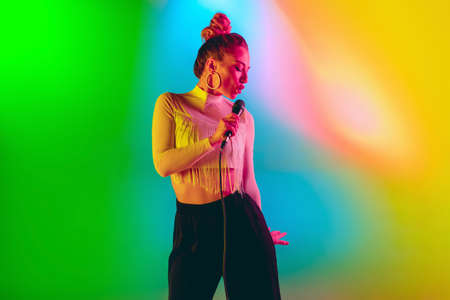 Bright mood. Young female caucasian inspired and expressive musician, singer performing on multicolored background in neon. Concept of music, hobby, festival, art. Joyful artist, colorful portrait.