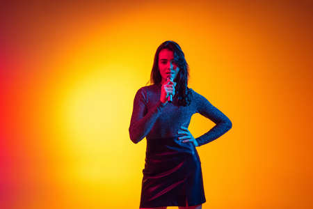 Young excited girl, student with long hair singing isolated on orange background in neon light, filter. Concept of emotions, youth, beauty