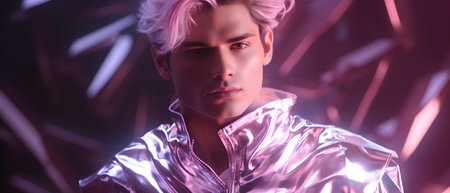 Beauty trends. Portrait of a beautiful girl with bright glitter makeup and pink hair posing in mixed color light. Makeup cosmetics and hairstyle.