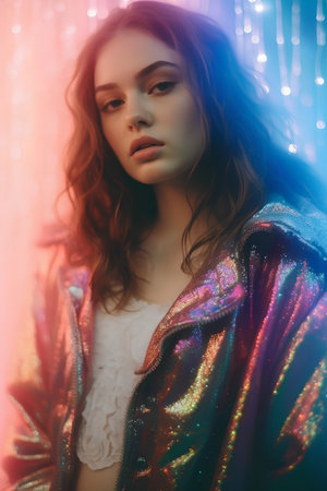 Young woman with long hair wears a colorful windbreaker, sitting against a vibrant pink background with neon light effects.