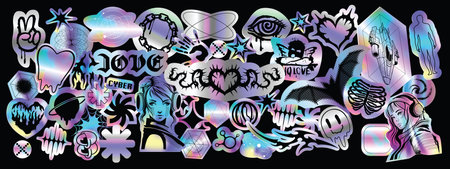 Holograph u2k sticker set, cyber holo icon pack, vector hologram space neon foil retro acid badge. Gothic vintage hearts, hype CD effect tag, anime girls graffiti clipart. Metal holograph sticker