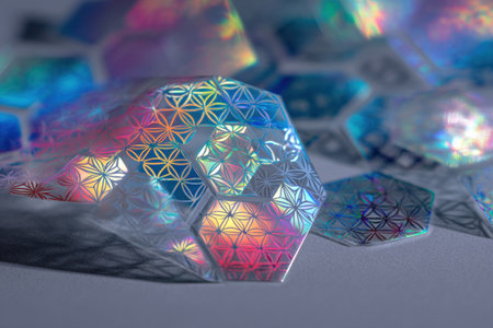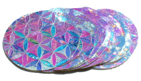 Colorful holographic stickers with intricate patterns shine under bright lights, creating a stunning display of design and color.