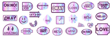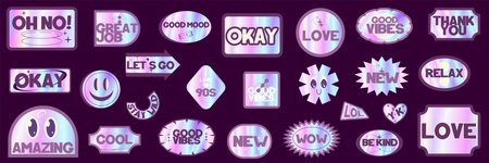 Sticker Y2k Hologram label set with text. Cool Rainbow gradient Y2k stickers pack. Holographic gradient retro stamp with quote. Vector illustration