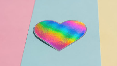 A vibrant, holographic heart-shaped sticker is prominently displayed on a solid blue background. The sticker exhibits a spectrum of colors, including shades of pink, blue, green, and yellow, creating a visually striking effect. The image evokes feelings of love, diversity, and positivity.