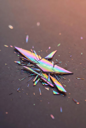 This stunning holographic background showcases glistening glass shards with a captivating blend of rainbow reflexes in pink and purple tones, creating a unique, abstract visual aesthetic that