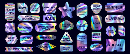 Set of Holographic Gradient Stickers in Various Shapes. Colorful Iridescent Labels