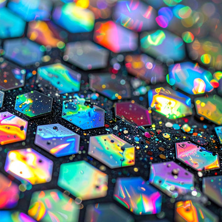 A dazzling macro view reveals a microscopic landscape of holographic hexagons.