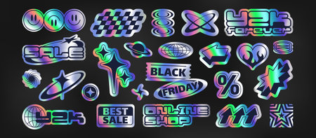 Holographic y2k label stickers with rainbow gradient, Black Friday tags and retro design icons. Chrome effect with smiling face, star and sale badge. Nostalgic elements for marketing or social media